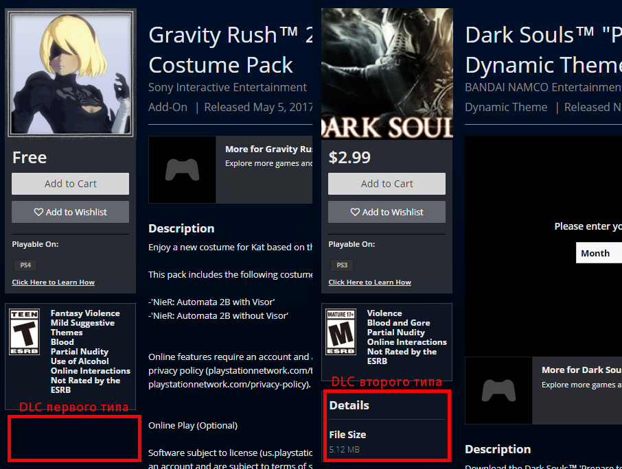 Для того, щоб зрозуміти якого типу ваше доповнення, перейдіть у Playstation Store, введіть у пошуку назву вашої гри та перейдіть на її сторінку. Прокрутіть вниз і в розділі “Доповнення” виберіть DLC, що вас цікавить. Подивіться в ліву частину сторінки під зображенням гри. Якщо там вказано розмір гри — це DLC другого типу. Якщо розміру немає — першого.